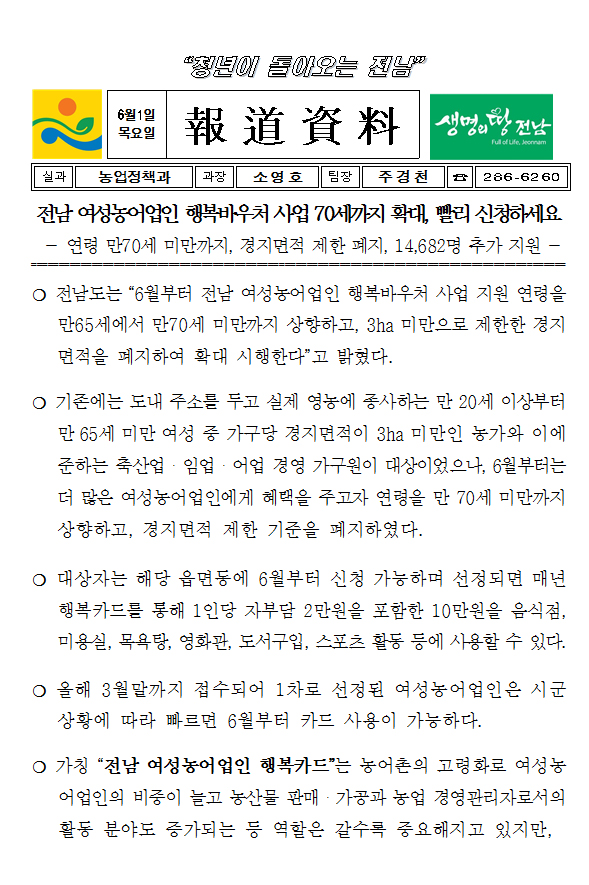 ¿©¼º³ó¾÷ÀÎ tfÆÀ ±¸¼ºÀ¸·Î ÀÎÇØ Çູ¹Ù¿ìó »ç¾÷ÀÌ ¿ùÃÊ ½ÃÇàµÇ¾ú°í, ÀÚ°Ýµî ³ªÀÌÁ¦ÇÑÀ¸·Î ¸¹Àº ÇýÅÃÀ» ¹ÞÁö ¸øÇß´ø ¿©¼º³ó¾÷ÀεéÀÌ 6¿ù 1ÀÏ ºÎÅÍ ¿¬·ÉÀº 70¼¼·Î È®´ëµÇ¾úÀ¸¸ç, °æÁö¸éÀû Á¦ÇÑÀº ÆóÁöµÇ¾ú´ä´Ï´Ù. ÀÌ¿¡ ¿ì¸® Àü³² ÇÑ¿©³ó ȸ¿ø´Ôµéµµ ½Åû´ë»óÀÌ µÇ¾ú´ä´Ï´Ù. ^^