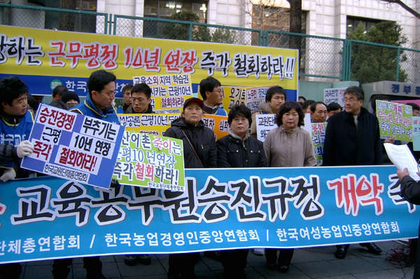 3¿ù 8ÀÏ ¿ÀÈÄ 4½ÃºÎÅÍ Á¤ºÎÁ¾ÇÕû»ç ÈĹ®¿¡¼ Çѱ¹±³¿ø´ÜüÃÑ¿¬ÇÕȸ(±³ÃÑ)´Â ±Ù¹«ÆòÁ¤ 10³â ¿¬Àå ÀúÁö¸¦ Ã˱¸ÇÏ´Â Áýȸ¸¦ °¡Á³´Ù. À̳¯ ÇÑ¿©³óÀº ¿ìÁ¤±ÔȸÀåÀÇ ¿¬´ë»ç¸¦ ÅëÇØ ³ó¾îÃ̱³»çÀÇ µµ½ÃÀ¯ÃâÀ» ºÎäÁúÇÏ´Â ±³À°°ø¹«¿ø ½ÂÁø±ÔÁ¤ °³Á¤ öȸ¸¦ ¿ä±¸ÇÏ¿´´Ù.