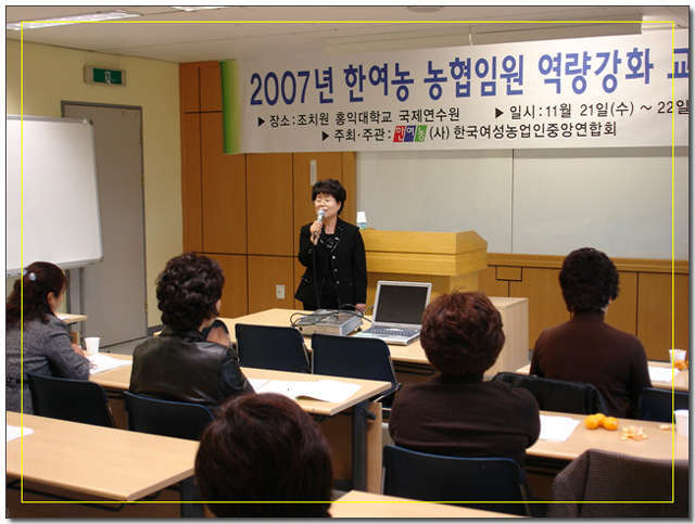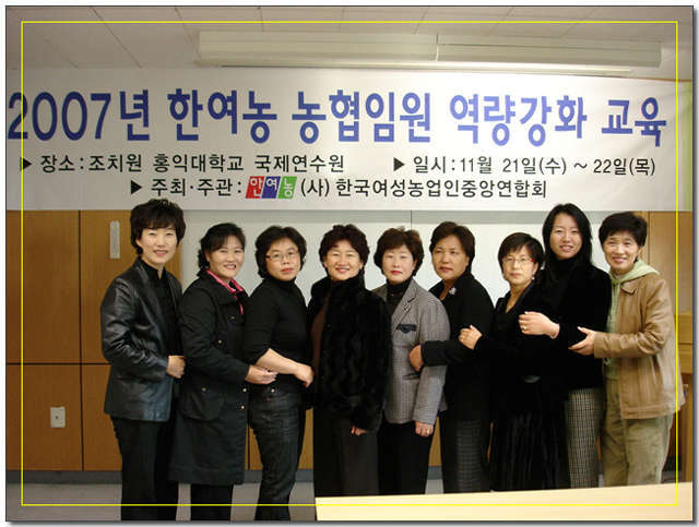 ¡Û ÀÏ ½Ã : 2007³â 11¿ù 21ÀÏ(¼ö) ~ 22ÀÏ(¸ñ) ¡Û Àå ¼Ò : Ãæ³² Á¶Ä¡¿ø È«ÀÍ´ëÇб³ ±¹Á¦¿¬¼ö¿ø ¡Û ÁÖ ÃÖ : Çѱ¹¿©¼º³ó¾÷ÀÎÁß¾Ó¿¬ÇÕȸ ¡Û ÁÖ °ü : Çѱ¹¿©¼º³ó¾÷ÀÎÁß¾Ó¿¬ÇÕȸ