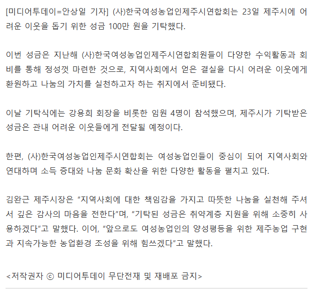 ÇÑ¿©³ó Á¦Áֽÿ¬ÇÕȸ(ȸÀå °¿ëÈñ)¿¡¼´Â Áö³ 2¿ù 23ÀÏ(¿ù) Á¦Áֽÿ¡ ¾î·Á¿î ÀÌ¿ôÀ» µ½±â À§ÇÑ ¼º±Ý 100¸¸¿øÀ» ±âŹÇÏ¿´½À´Ï´Ù. »çÁø ³²°Ü º¾´Ï´Ù~^*^