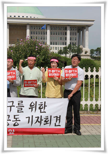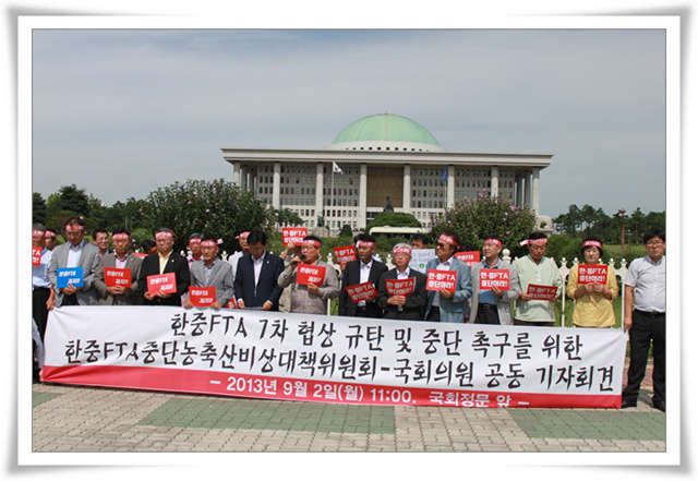 ÀÌ¿¡ ±âÀÚȸ°ß¿¡ Âü¼®ÇÑ ¿ì¸®´Â ÇÑÁßFTA¸¦ ¸·¾Æ³»±â À§ÇØ ¸ðµç ¿ª·®À» µ¿¿øÇÒ °ÍÀÓÀ» ºÐ¸íÈ÷ ¹àÇôµÐ´Ù. ¿ì¸® ¸Ô°Å¸®¸¦ ÁöÄѳ»±â À§ÇØ, ½ÄŹÀÇ ¾ÈÀü¼ºÀ» È®º¸Çϱâ À§ÇØ, ´õ ÀÌ»ó ³ó¾÷ÀÌ ³ª¶ôÀ¸·Î ¶³¾îÁöÁö ¾Ê°Ô ÈûÂ÷°Ô ÅõÀïÇÒ °ÍÀÌ´Ù. ÀÌÁ¦¶óµµ Á¤ºÎ´Â ¿ì¸®³ó¾÷À» º¶û ³¡À¸·Î ³»¸ô ÇÑÁßFTAÃßÁøÀ» Áï°¢ Áß´ÜÇÒ °ÍÀ» °·ÂÈ÷ Ã˱¸ÇÏ´Â ¹ÙÀÌ´Ù.