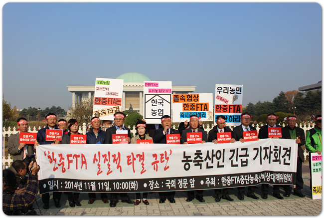 ÇÑ-ÁßFTA ½ÇÁúÀû Ÿ°á ±Ôź ³óÃà»êÀÎ ±ä±Þ ±âÀÚȸ°ß ¢º ÀÏ ½Ã : 2014³â 11¿ù 11ÀÏ(È) 10:00 ~ ¢º Àå ¼Ò : ±¹È¸ Á¤¹® ¾Õ ¢º ÁÖ ÃÖ : ÇÑ-ÁßFTAÁߴܳóÃà»êºñ»ó´ëÃ¥À§¿øÈ¸