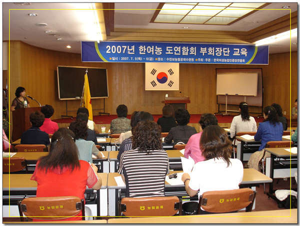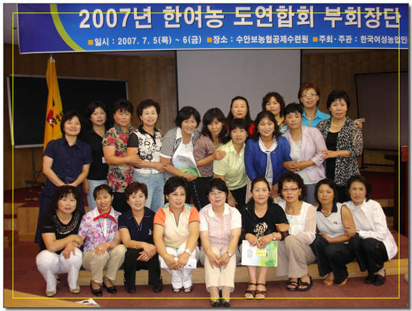 2007 ÇÑ¿©³ó µµ¿¬ÇÕȸ ºÎȸÀå´Ü ±³À° ¢º ÀÏ ½Ã : 2007³â 7¿ù 5ÀÏ(¸ñ) ~ 7¿ù 6ÀÏ(±Ý) ¢º Àå ¼Ò : ÃæºÏ ¼ö¾Èº¸³óÇù°øÁ¦¼ö·Ã¿ø ¢º ÁÖÃÖ.ÁÖ°ü : (»ç)Çѱ¹¿©¼º³ó¾÷ÀÎÁß¾Ó¿¬ÇÕȸ