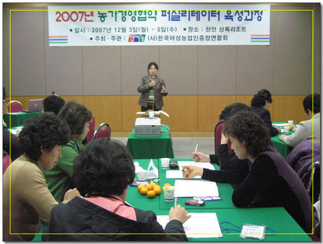 ³ó°¡°æ¿µÇù¾à ÆÛ½Ç¸®Å×ÀÌÅͱ³À° ‣ ÀÏ ½Ã : 2007³â 12¿ù 3ÀÏ(¿ù) ~ 5ÀÏ(¼ö) ‣ Àå ¼Ò : Ãæ³² õ¾È »ó·Ï¸®Á¶Æ® ‣ ÁÖ ÃÖ : (»ç)Çѱ¹¿©¼º³ó¾÷ÀÎÁß¾Ó¿¬ÇÕȸ